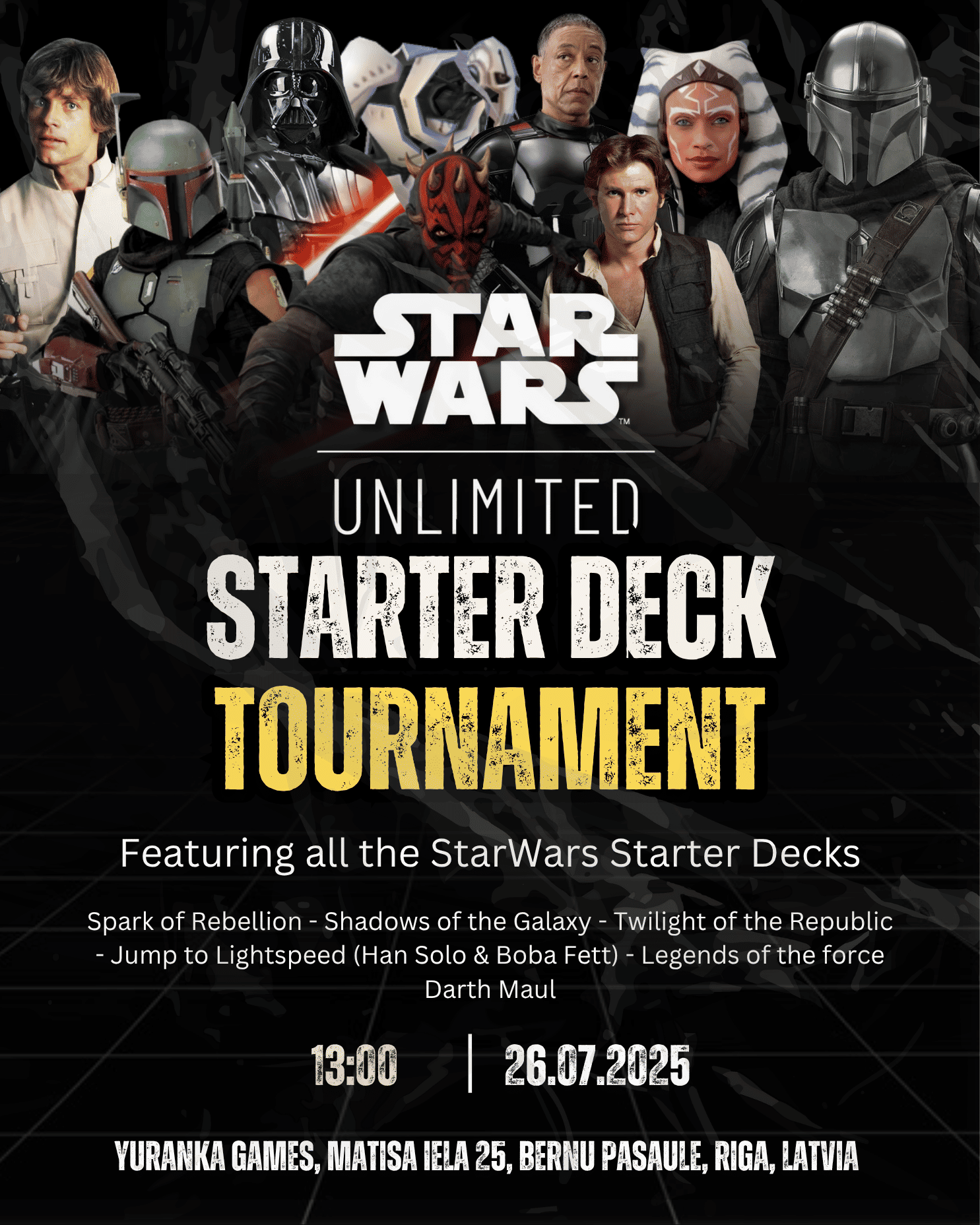 Join Yuranka Games for weekly beginner-friendly battles in the Star Wars Unlimited universe! Bring your own deck, buy one, or play for free if it's your first time β with booster pack prizes and epic playmats up for grabs.